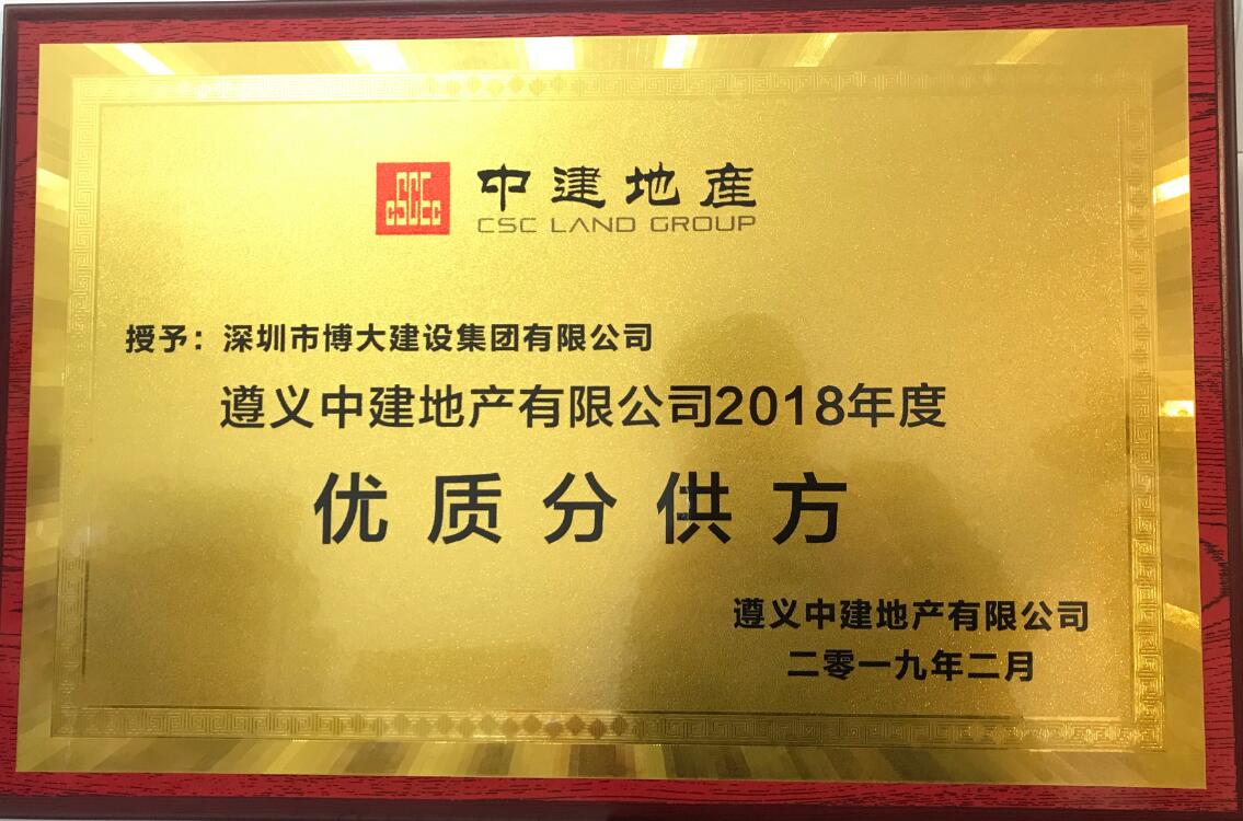 博大建設集團秉承“讓顧客有幸福感”的企業魂,與遵義中建地產建立起良好的戰略合作關系,保安全、保質量、保工期、保服務、守合同,以優秀成果獲得客戶的高度認可,榮獲遵義中建地產2018年度“優質分供方”。