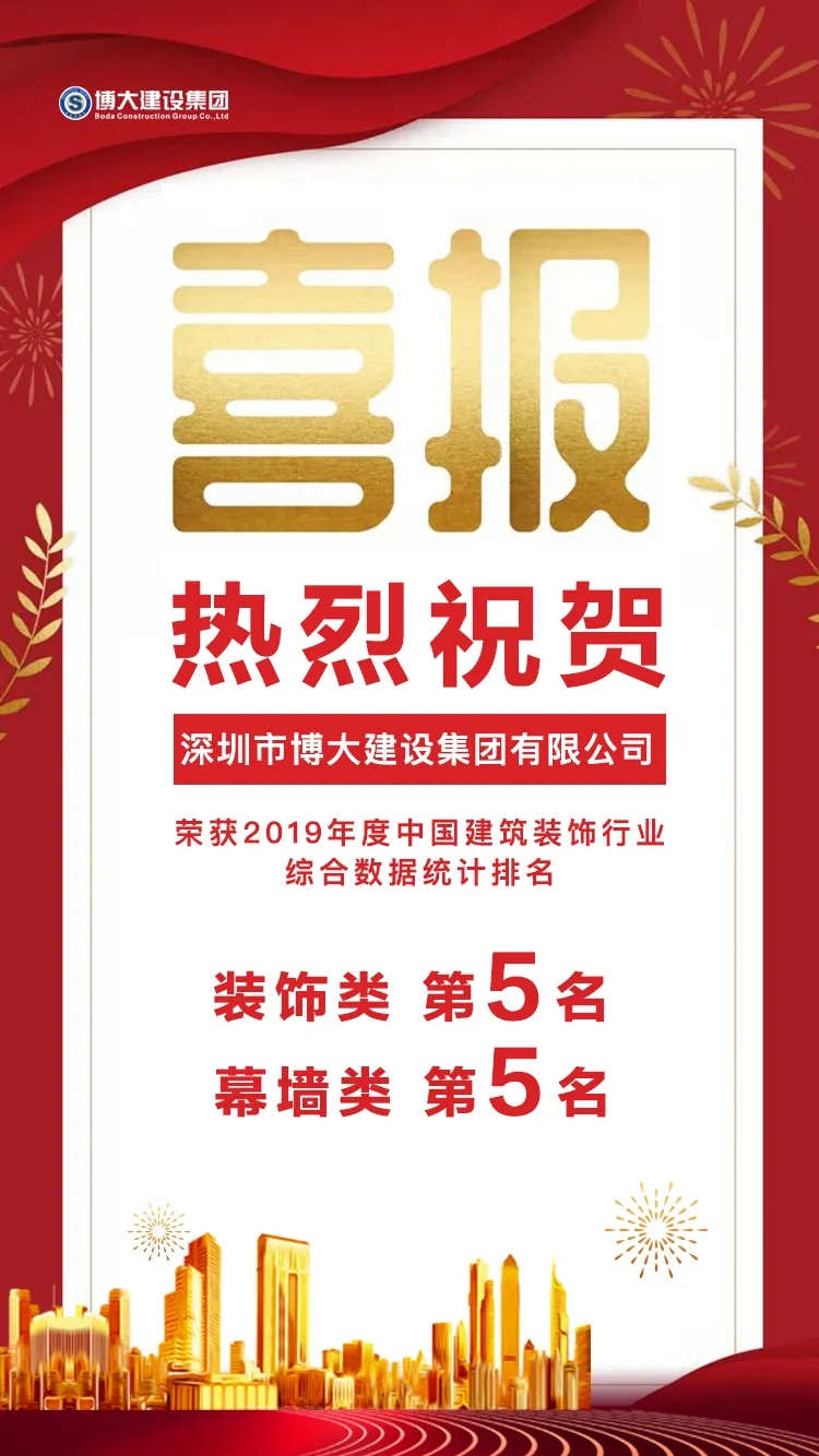 2020年12月23日上午,2019年度中國建筑裝飾行業綜合數據統計排名發布會在深圳市隆重舉行,深圳市博大建設集團有限公司憑借綜合實力在裝飾類和幕墻類同步躍居全國第五名!